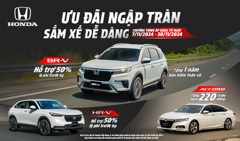 Với mong muốn mang đến cho khách hàng nhiều hơn nữa cơ hội trải nghiệm các mẫu xe ô tô Honda và tận hưởng những khoảnh khắc trọn vẹn bên gia đình, Honda Việt Nam (HVN) phối hợp cùng hệ thống Nhà Phân phối triển khai chương trình khuyến mại hấp dẫn từ ngày 07 đến hết ngày 30 tháng 11 năm 2024 cho các dòng xe: Honda BR-V, Honda HR-V, Honda Accord.